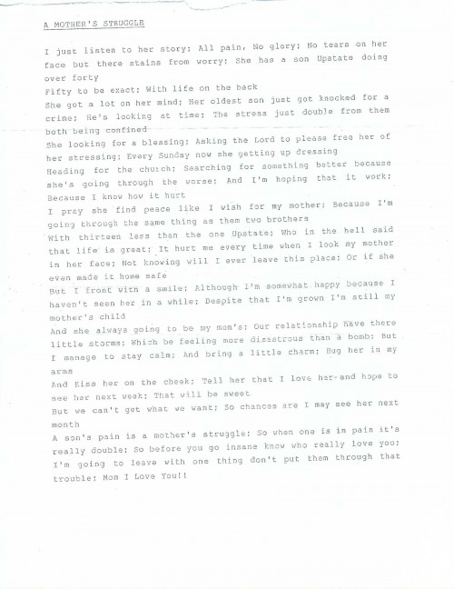 As I have grown in prison into a man my perspective on life has changed from the mindset of the kid that I was when I entered this system. I believe in karma and having empathy for others; treating and caring for others in how I will like done for myself. Being supportive, honest, considerate, and humorous are just some of the elements that define my character.